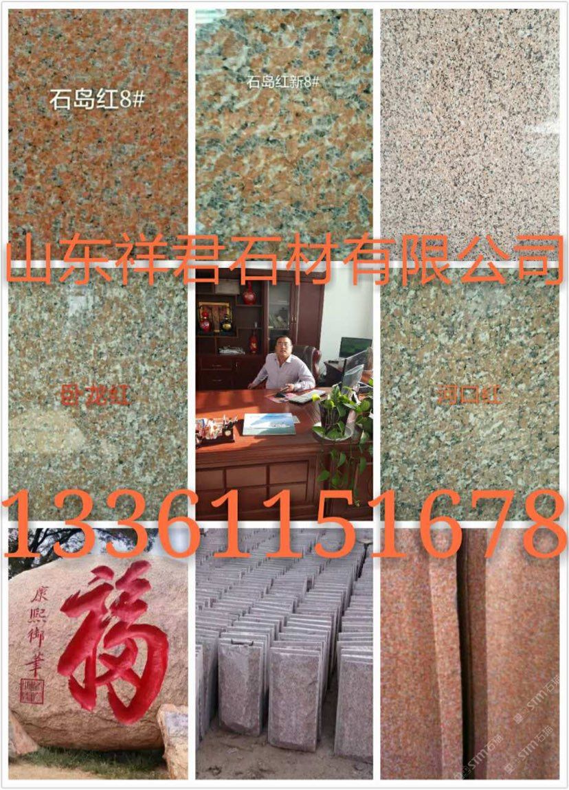 山東榮成市祥君石材有限公司廠價直銷!石島紅!!櫻花紅!!榮成灰!!皇室冰花??!皇室瑪瑙 ??! 紫晶鉆!!皇室珍珠!!皇室玫瑰!!皇室啡!!皇室棕鉆!!中磊紅!!龍須紅!!白麻!!黃金麻??!中國棕!!文登灰!等山東石材及異型加工。全自動磨光,大型噴砂機(jī).紅外線切割。