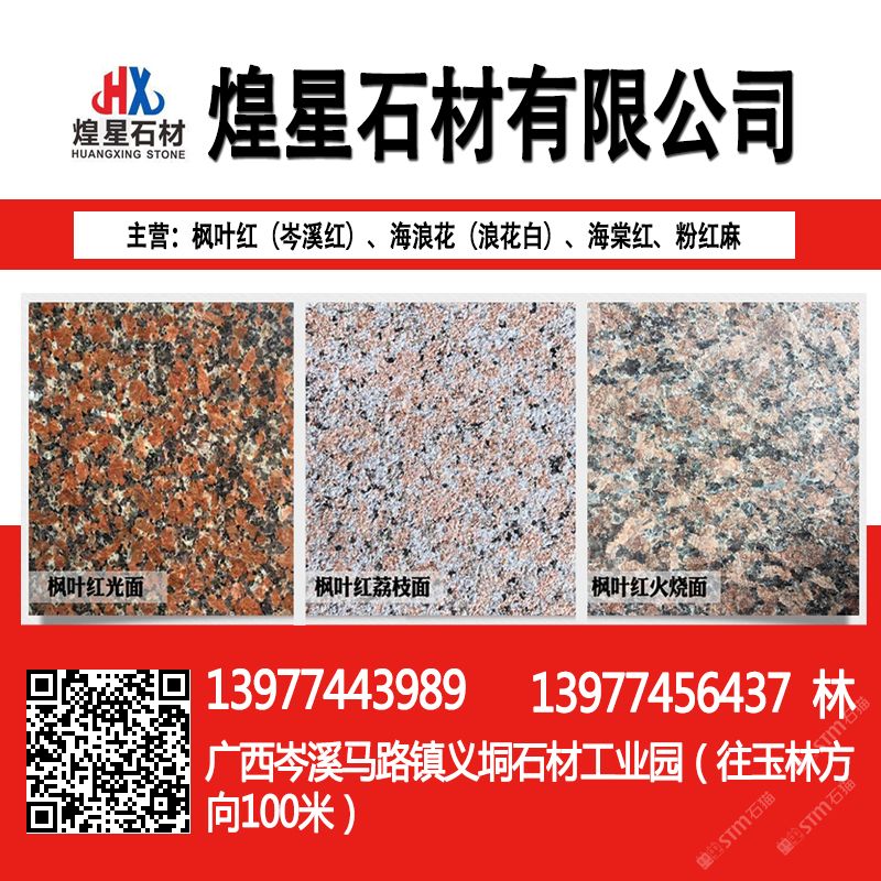 岑溪市煌星石材位于岑溪市馬路鎮(zhèn)義垌石材工業(yè)園,主要生產(chǎn)銷(xiāo)售:岑溪紅(楓葉紅),海浪花,海棠紅,三堡紅,粉紅麻,鐘山青,光板,毛板,火燒板,荔枝面,路沿石,異形板,大板以及各種工程板。\\\\\\\\\\\\\\\ 本廠加工設(shè)備完善,技術(shù)力量雄厚,有承接大型工程的實(shí)力和經(jīng)驗(yàn):產(chǎn)品優(yōu)質(zhì),價(jià)格合理,致力于為客戶(hù)提供周到,完善的服務(wù),憑借良好的信用,贏得廣大顧客的信任。歡迎新老客戶(hù)前來(lái)洽談業(yè)務(wù)!