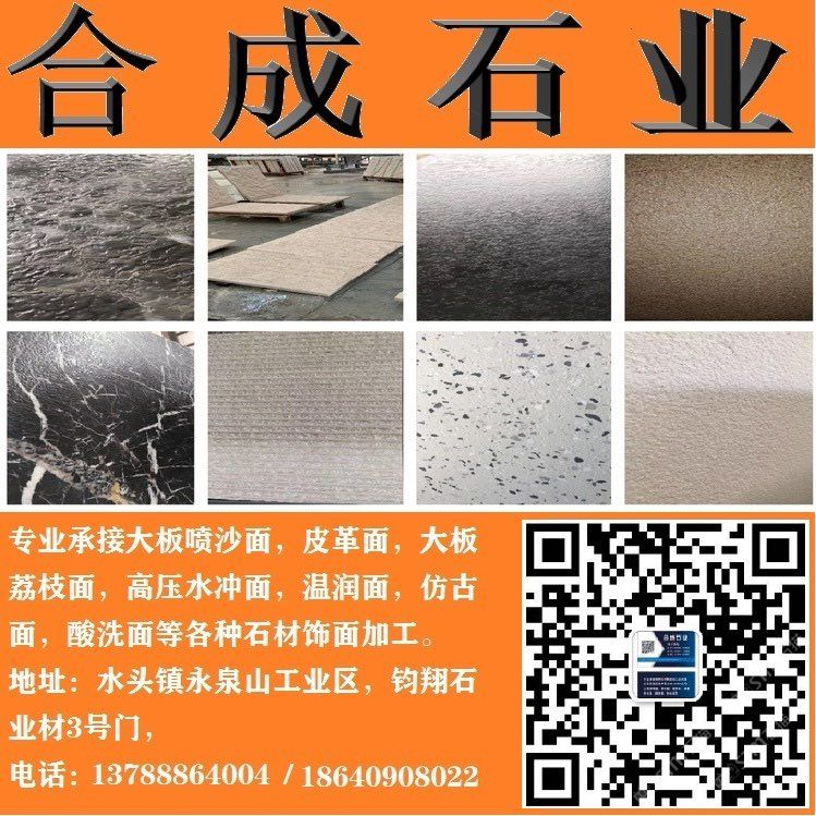 專業(yè)承接皮革面、溫潤(rùn)面、噴沙面,鋼砂面、高壓水沖面,大板荔枝面,絲綢面,溫潤(rùn)面,磨砂面,布紋面,斧鑿面(龍眼面),仿古面等各種飾面加面