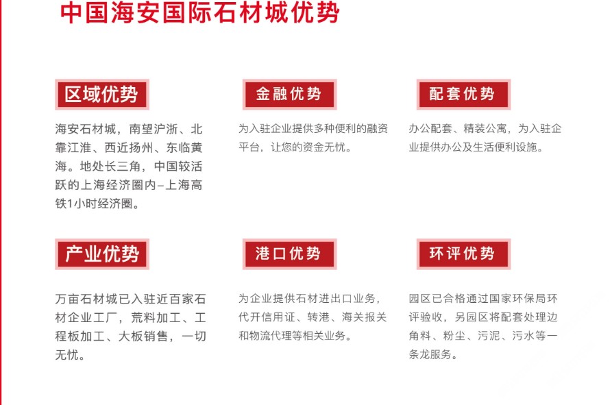 中國海安國際石材城 項目得到當?shù)卣拇罅χС?,投入基礎設施20億元,主干道雙向六車道已全面通車,綠化、官網、路燈、水電等七通一平已全部到位,達到一級城市主干道水平。石材城總占地面積15000畝,一期占地面積3000畝,規(guī)劃總建筑面積約138萬平方米,于2013年1月18日全面開工建設,目前已有80多家企業(yè)正式投產。 功能規(guī)劃 以新型石材生產加工型企業(yè)為主體的工業(yè)生產區(qū),以配套廠區(qū)建設和生產服務為主體的商業(yè)生活區(qū),以為整個園區(qū)提供商務辦公、行政物流綜合配套的城市綜合區(qū)三大功能區(qū)域。 功能涵蓋 大型石材加工區(qū)、異型、雕刻加工區(qū)、馬賽克生產區(qū)、崗石、石英石生產加工區(qū)、荒料保稅區(qū)、大板展示區(qū)、奇珍玉石區(qū)、園林景觀區(qū)、板材交易區(qū)、物流園區(qū)、石材機械制造區(qū)、商務休閑娛樂配套服務區(qū)。