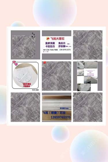 飛民大理石 聯(lián)系人:黃先生    136****7000 查看 手機號碼:無 主營范圍: 石材工藝品、其他、異型加工、花崗巖加工、 企業(yè)地址:福建南安水頭鎮(zhèn)盛達石材城C4明捷石材