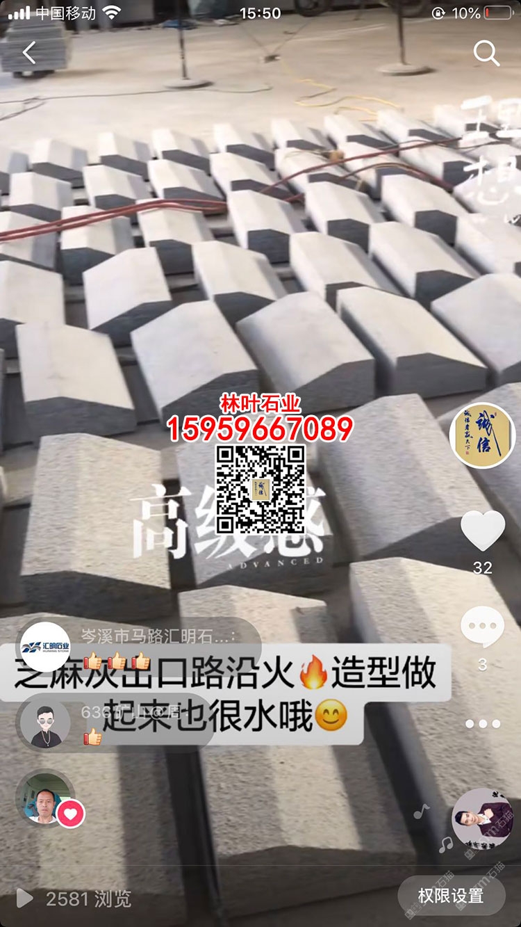 發(fā)布信息: 林葉石業(yè)長泰工廠(林總15959667089微信同號)專業(yè)老礦芝麻黑與芝麻灰供應(yīng)商,專注于出口及高品質(zhì)工程國內(nèi)外園林景觀石材;主營:老礦芝麻黑墓碑石、正礦吳田山G654窗臺板、G654芝麻黑牛鼻子、芝麻黑石材游泳池蓋板、老礦芝麻黑出口高品質(zhì)工程板、老礦654小方塊馬蹄石、芝麻灰G655路沿石、深灰麻石材、中灰麻石材、深灰色花崗巖、黑色麻石等光面、燒面、荔枝面、墓碑石材、地鋪石材、園林景觀工程、路沿石材等;林葉石業(yè)寧德工廠(葉總18050650127微信同號)專業(yè)新礦芝麻黑寧德小藍寶,廠礦一體,體格優(yōu)惠,真誠希望您的光臨與合作!(聲明上傳產(chǎn)品圖片均是本廠加工生產(chǎn))