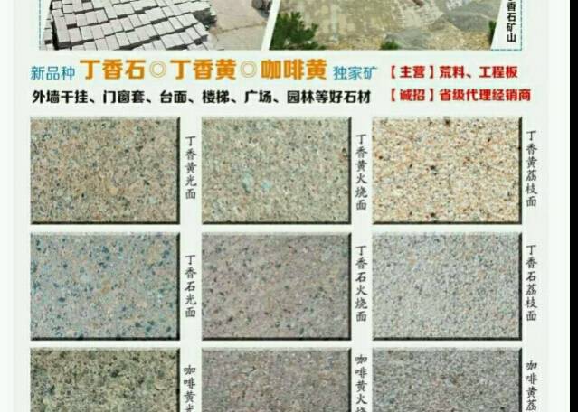 發(fā)布信息: [微笑]礦、廠、銷一體企業(yè)[微笑] [強(qiáng)]自有.獨(dú)特.新品---丁香石、丁香黃、咖啡黃[強(qiáng)] 珍珠蘭 外墻干掛、門窗套、臺面、樓梯、廣場、園林等好石材 【主營】荒料、板材、工程板 誠招:省、市級代理經(jīng)銷商 財(cái)富熱線:15860870557楊