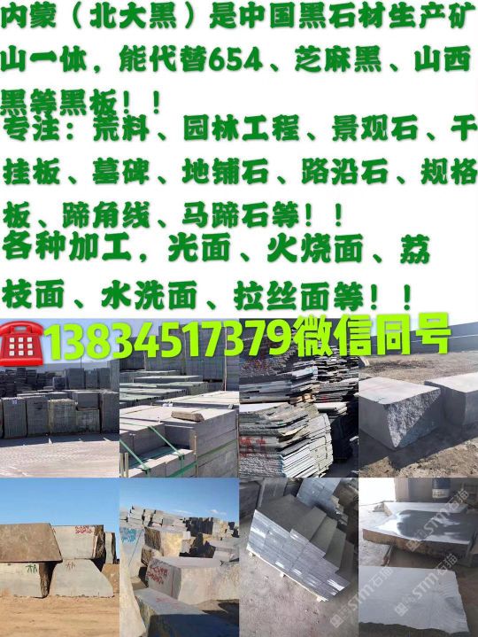 發(fā)布信息: 蒙古(北大黑)是中國(guó)黑石材生產(chǎn)礦山一體、能代替654,芝麻黑,山西黑:等黑板 ※誠(chéng)信為本 專(zhuān)注:荒料,園林工程,景觀(guān)石,干掛板,墓碑、地鋪石、路沿石、規(guī)格板、蹄角線(xiàn),馬蹄石。 各種加工、光面、火燒面、荔枝面、水洗面、拉絲面等等! 電話(huà):13834517379微信同號(hào)