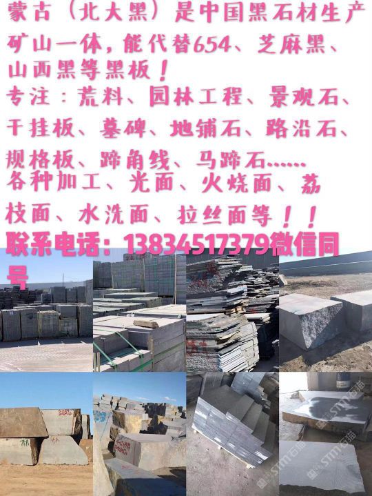 發(fā)布信息: 蒙古(北大黑)是中國(guó)黑石材生產(chǎn)礦山一體、能代替654,芝麻黑,山西黑:等黑板 ※誠(chéng)信為本 專注:荒料,園林工程,景觀石,干掛板,墓碑、地鋪石、路沿石、規(guī)格板、蹄角線,馬蹄石。 各種加工、光面、火燒面、荔枝面、水洗面、拉絲面等等! 電話:13834517379微信同號(hào)