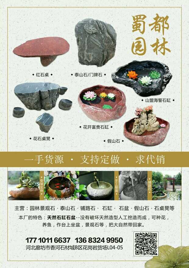 發(fā)布信息: 專營:泰山石、景觀石、天然石頭花盆水盆、鋪路石、假山石、石桌石凳等,一手貨源,支持定做,求代銷?。?/span>