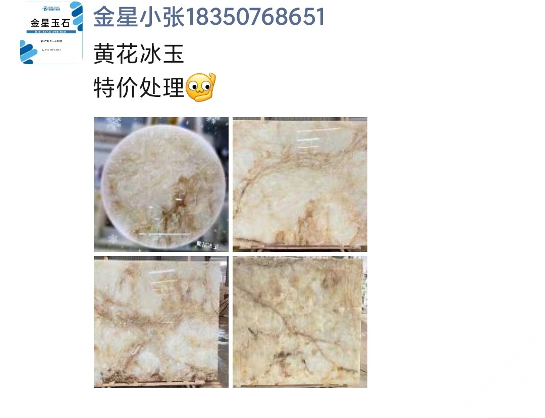 金星石業(yè)有限公司 聯(lián)系人:黃    152****2319 查看 183****8651 查看 主營范圍: 大板批發(fā)、荒料、大理石加工、石材交易市場、玉石加工、 企業(yè)地址:福建泉州南泰石材城H8