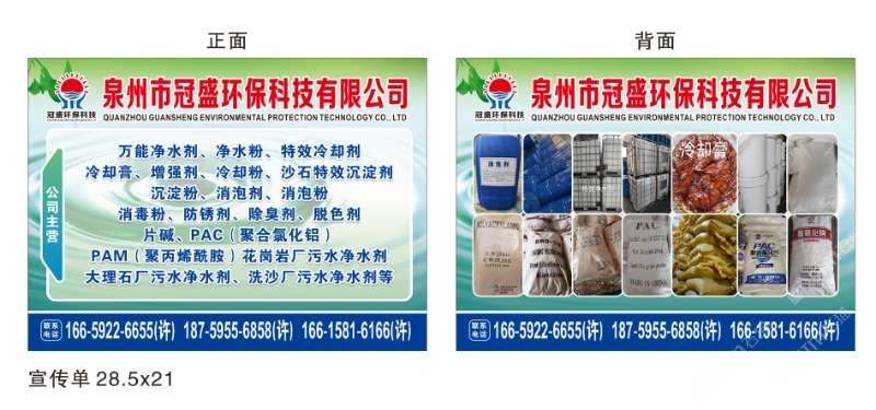 發(fā)布信息: 冠盛環(huán)保科技16615816166 主營(yíng)產(chǎn)品:凈水劑,冷卻劑,冷卻粉,大理石人造石專(zhuān)用凈水劑,沉淀粉,消泡劑,消毒凈水劑,防銹凈水劑,除銹劑,除臭劑,聚丙烯酰胺,聚合氯化鋁,鹵精,洗沙專(zhuān)用凈水劑,壓濾機(jī)專(zhuān)用凈水劑,陶瓷廠(chǎng)專(zhuān)用凈水劑(黃藥 白藥)等所有水處理環(huán)保材料……