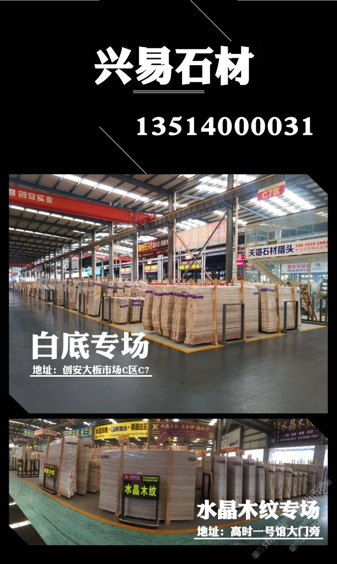 發(fā)布信息: ? ? ? 【興易大理石】 ? ? 白底水晶木紋專場(chǎng) ? 我司主營(yíng)水晶木紋系列產(chǎn)品: 水晶木紋,翡翠木紋,國產(chǎn)藍(lán)金沙,白金沙,彩虹木紋 ? 滿倉白底水晶木紋新料任選, 條板,大板 荒料均有售,統(tǒng)一花色,防水背膠供應(yīng)! 部分礦口特惠,歡迎撿漏 歡迎新老客戶來電垂詢! ? ?地址: ? 濱海高時(shí)物流一號(hào)館大門旁 ? 創(chuàng)安c區(qū)c7區(qū)興易石材 ? 電話:13514000031小李 ? ?
