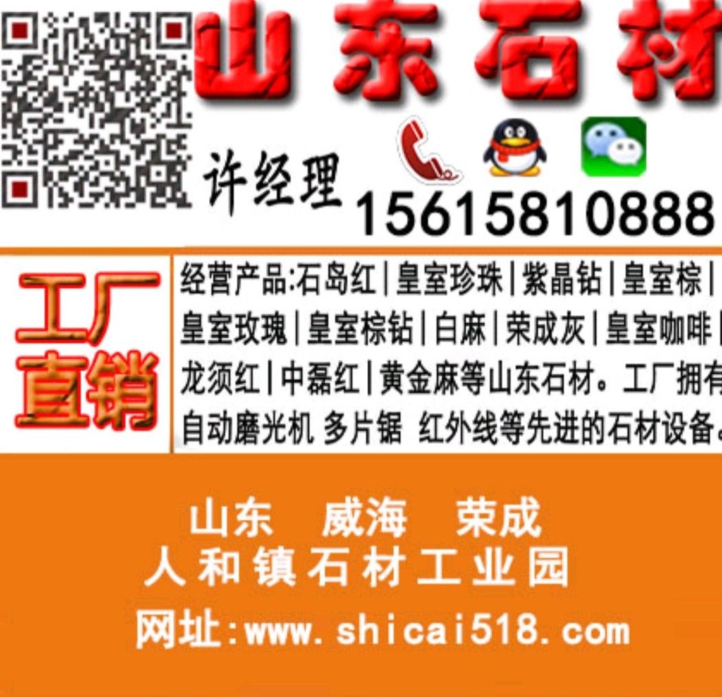 發(fā)布信息: 工廠供應(yīng)石島紅系列 紫晶鉆 中國棕 皇室啡 皇室玫瑰 皇室珍珠 皇室棕鉆 皇室冰花 榮成粉鉆 榮成灰麻 白麻等本地石材。擁有全自動磨光機,紅外線切割機,多片鋸等先進的石材加工設(shè)備。歡迎詢價考察。 電話&微信:15615810888 網(wǎng)址:www.518shicai.cn