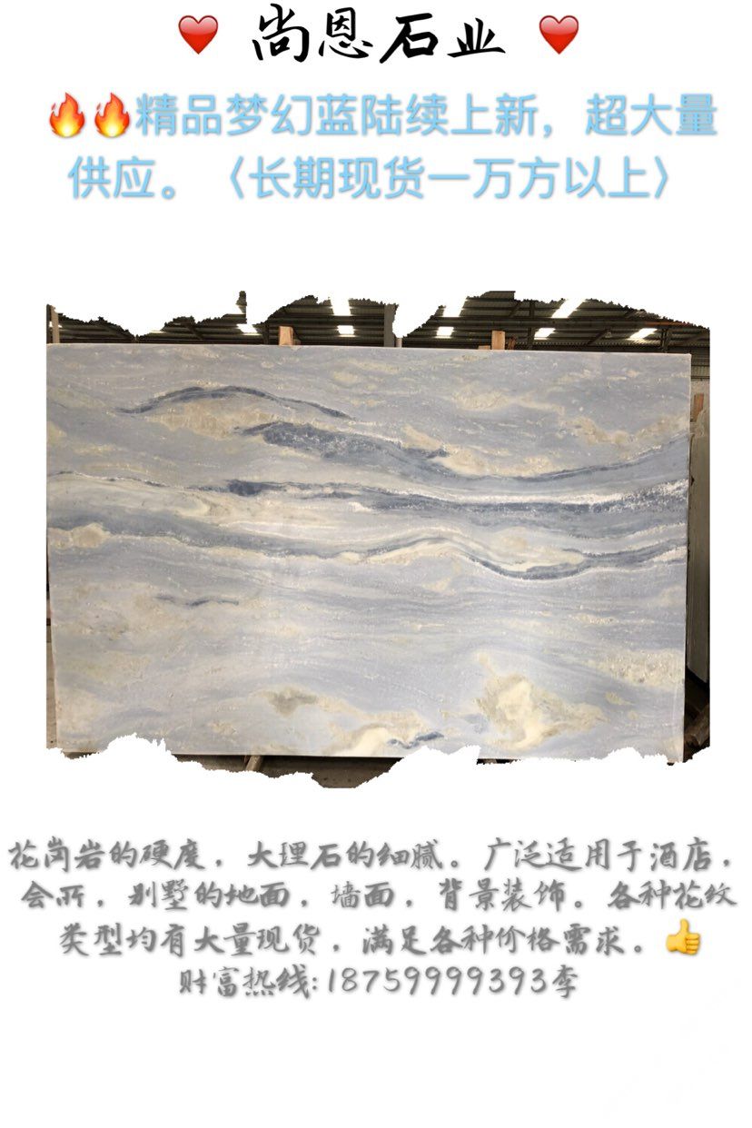 發(fā)布信息: ?? 藍色blue?永不凋零的奢華! ?巴西輕奢石【夢幻藍】【藍水晶】【藍天白云】 ??礦山直銷批發(fā)產(chǎn)品,價格,奢享從未如此簡單,量大更優(yōu)惠。 ??藍色一直是高端別墅,酒店,會所裝飾色調(diào)。各種紋路,各種底色應有盡有,任您挑選。期待與您的合作[耶] ??:18759999393李 地址:鵬翔石材城主通道F9