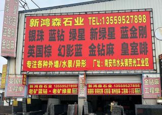 新鴻森石業(yè)主營產(chǎn)品:綠星1,新綠星,藍珍珠,銀珠,幻影藍,藍金剛1,七彩啡珠,皇室啡,英國棕(黑紅),安哥拉黑(黑水晶),金鉆麻(巴西),灰珍珠企業(yè)地址:福建南安建材市場40棟23號